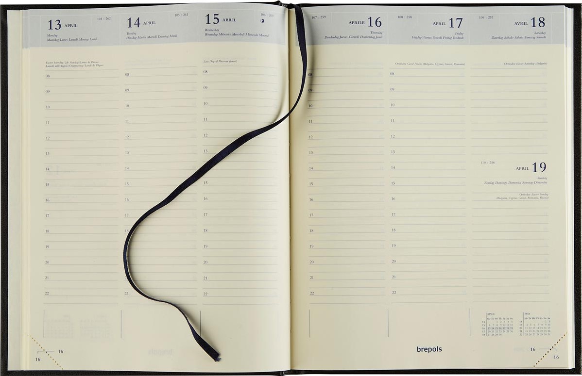 1 week per 2 pagina's Uurindeling (8u - 22u) 6-talig Boekgebonden Crèmekleurig papier van 70 g/m² Met leeslint en scheurhoekjes Kaft uit effen kunstleder Ft 171 x 220 mm Certificaat: FSC Mix