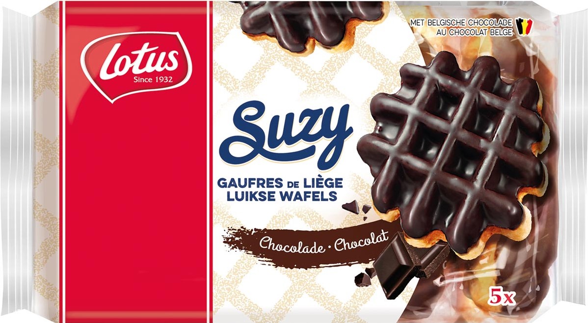 Stel een vraag over Lotus Suzy luikse wafel met chocolade, 57,6 g, pak van 5 stuks