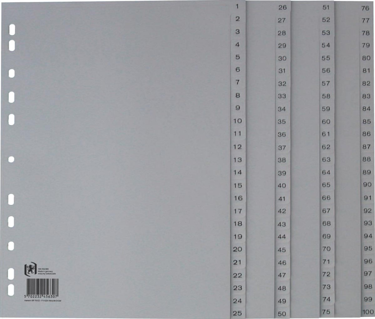 Specificaties Oxford tabbladen, A4, uit PP, 11-gaatsperforatie, 100 genummerde tabs, grijs