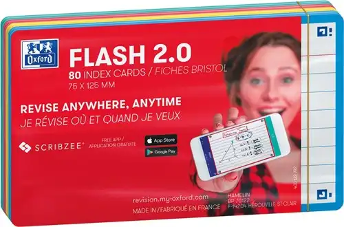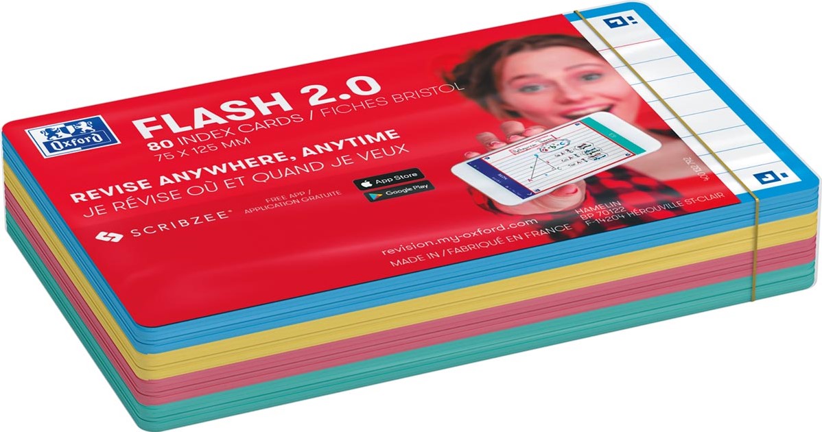 Artikelomschrijving Oxford Flash 2.0 flashcard starterkit, gelijnd, A7, assorti, pak van 80 vel