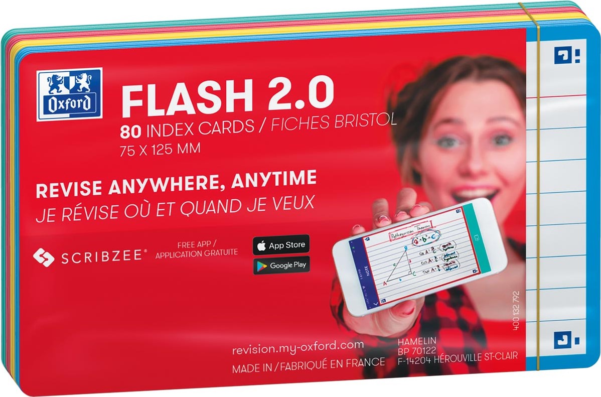 Specificaties Oxford Flash 2.0 flashcard starterkit, gelijnd, A7, assorti, pak van 80 vel