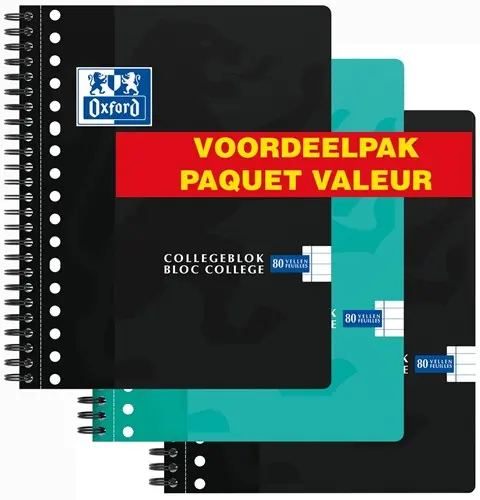 Artikelomschrijving Oxford School collegeblok, ft A5+, 160 bladzijden, 17-gaats, gelijnd, assorti, 3 stuks