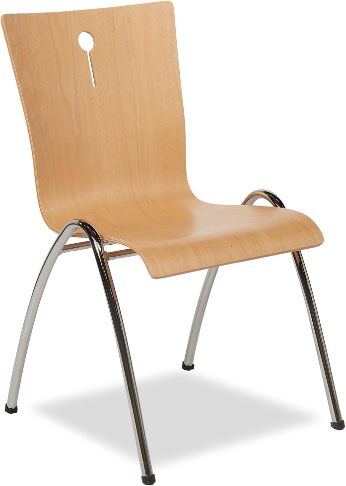 Een representatieve, Stapelbare Stoel die in verschillende uitvoeringen geproduceerd kan worden. De uitsparing in de rug geeft een authentiek karakter aan de Stoel.Deze Stapelbare Stoel is stapelbaar tot maximaal 6 Stoelen.. De kuip is van multiplex in transparante lak.