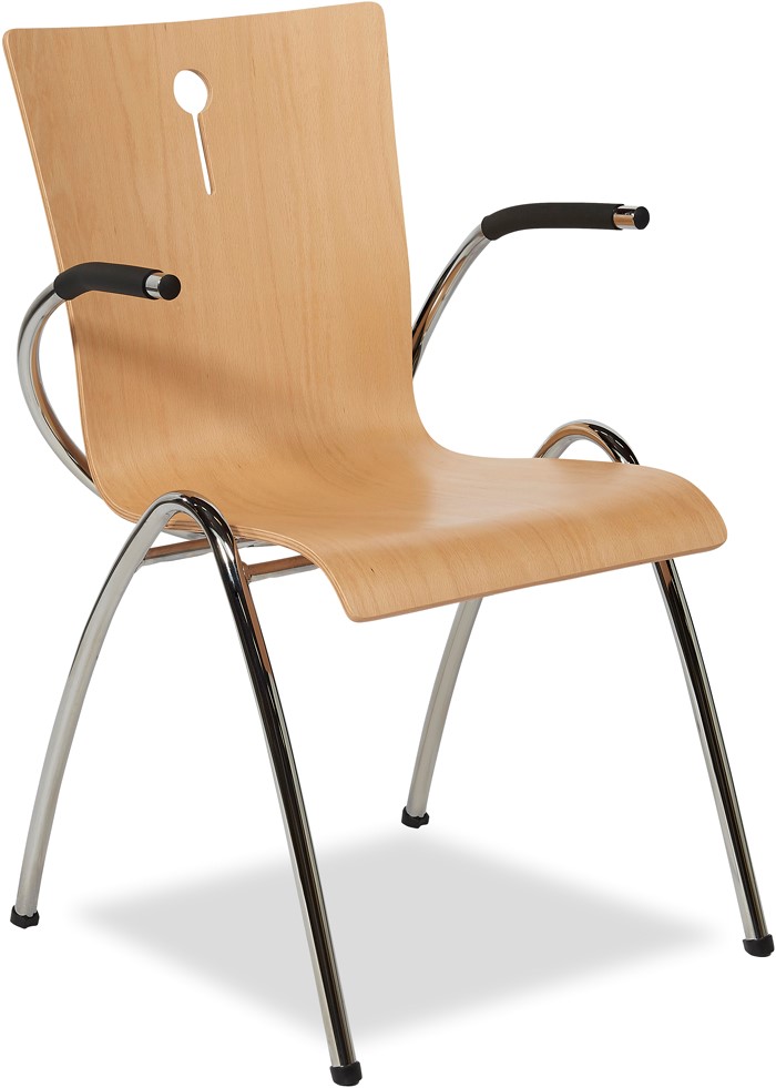 Een representatieve, Stapelbare Stoel die in verschillende uitvoeringen geproduceerd kan worden. De uitsparing in de rug geeft een authentiek karakter aan de Stoel.Deze Stapelbare Stoel is stapelbaar tot maximaal 6 Stoelen.. De kuip is van multiplex in transparante lak.