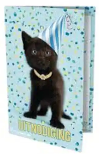 6 Stijlvolle uitnodigingskaarten met daarop een poesje met een feesthoedje op en de tekst: 'Uitnodiging'.