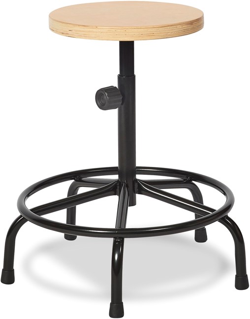 Eigentijdse, in hoogte verstelbare Werkkruk met multiplex zitting en stalen kruisvoet.De zitting is van multiplex, in transparante lak.