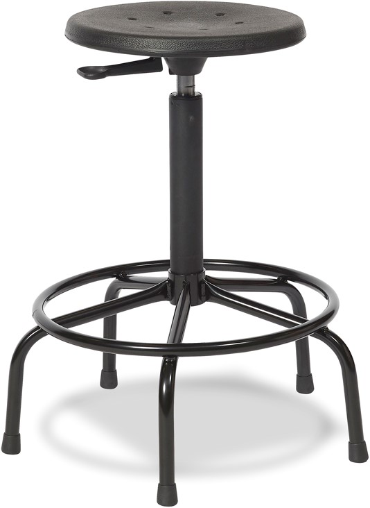 Eigentijdse, in hoogte verstelbare Werkkruk met polyurethaan zitting en stalen kruisvoet.Is voorzien van een gasveer met ringverstelling.
