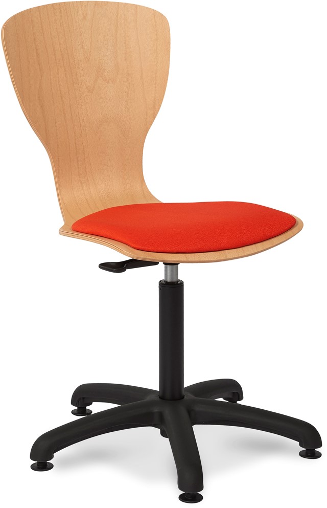 Een in hoogte verstelbare Werkstoel met kuipzitting. Rug in multiplex uitgevoerd in transparante lak en zitting gestoffeerd. Voorzien van een frame met gasveer en hendel in de kleur zwart.