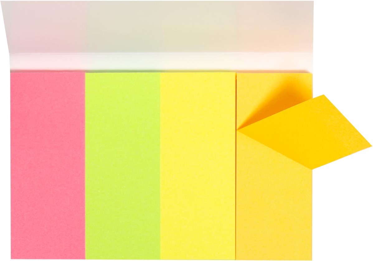 Herpositioneerbaar, beschadigt ondergrond niet Makkelijk beschrijfbaar Ft 20 x 50 mm Blister van 4 neonkleuren (roze, groen, geel en oranje), 50 tabs per kleur Certificaat: FSC Mix
