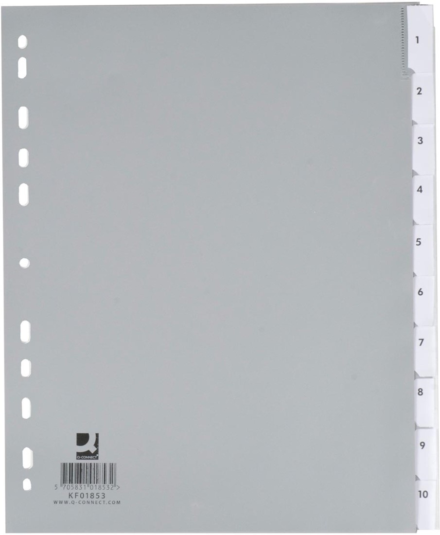 Specificaties Q-CONNECT tabbladen, A4, PP, 11-gaatsperforatie, 10 tabs, grijs