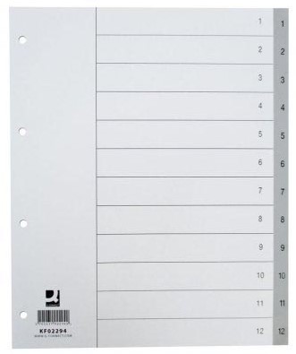 Artikelomschrijving Q-CONNECT tabbladen, A4, PP, 11-gaatsperforatie, met indexblad, set van 1-12, 12 tabs, grijs