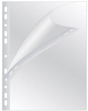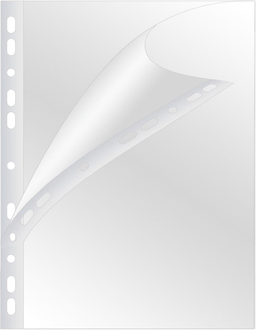 Voor ft A4. Uit PP van 100 micron. Gekorreld. Open boven en aan de ponsrand. 11-gaatsperforatie. Doos van 100 stuks.