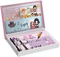 In deze set bevinden zich sticker vellen, een stencil met sjablonen, 1 clip, 2 stuks zelf inktende stempelsets, een brush pen, viltstift en een paarse glitter pen om op de juiste manier te handletteren.