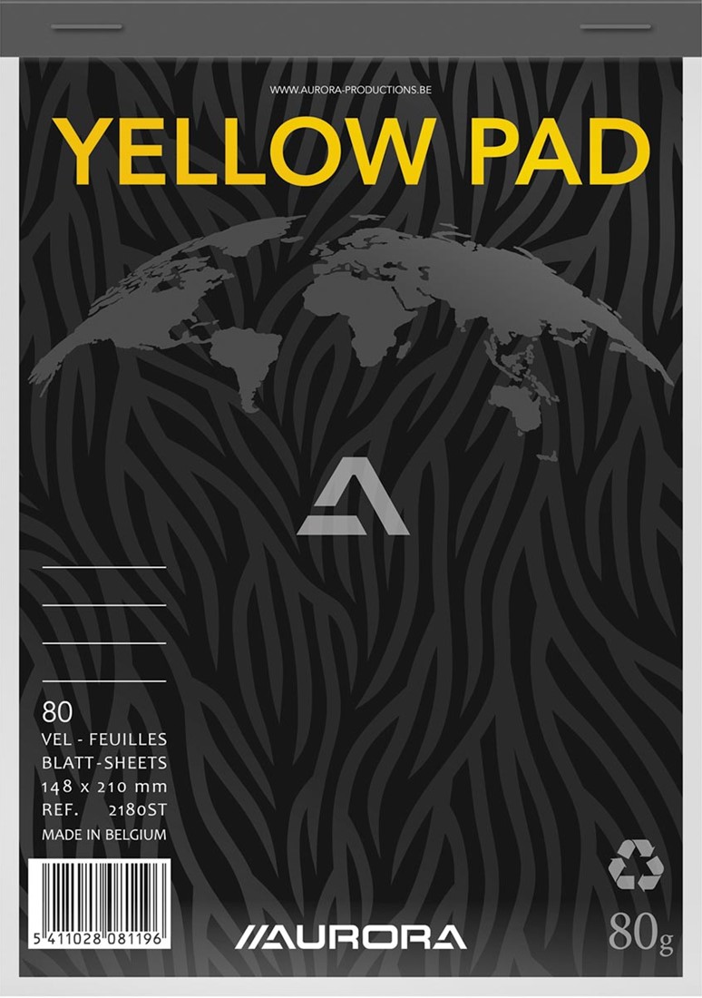 Gerecycleerd papier van 80 g/m². Blok van 160 bladzijden (80 vel). Kopgeniet. Gelijnd. Kleur: geel.