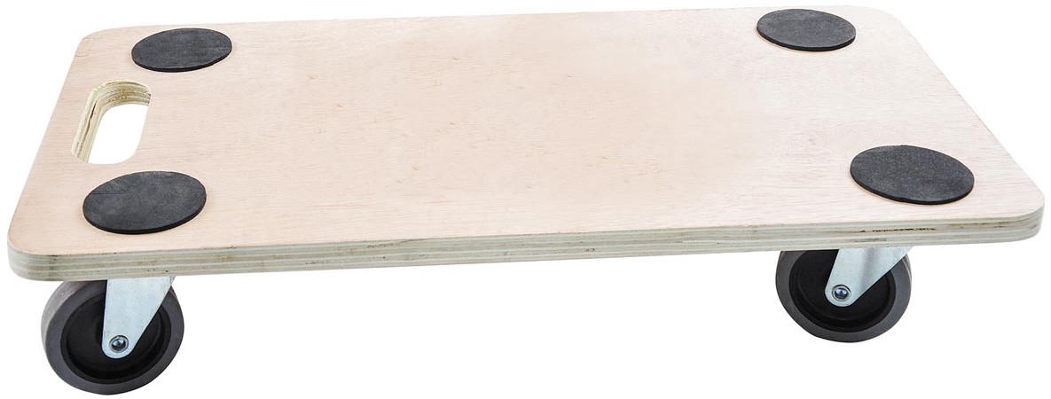 Met 4 zwenkwielen Met handvat en antislipmatjes Draagkracht 250 kg Uit multiplex Ft 57,5 x 29 x 11 cm (l x b x h) Certificaat: FSC 100% - C117117