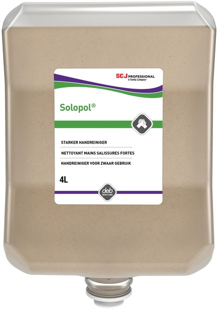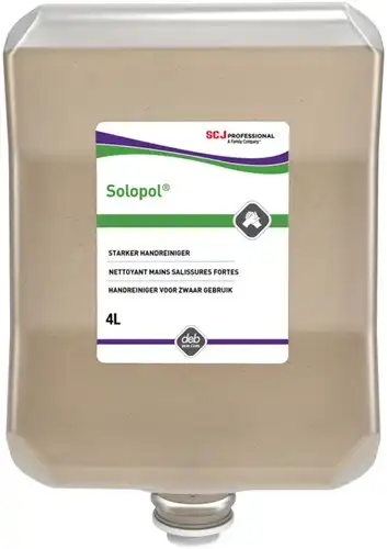 Solopol® is een handreiniger voor zware vervuilingen een oplosmiddelvrije handreinigingspasta met schrobberende bestanddelen om zware vervuilingen zoals olie, vet, roet, smeermiddelen en algemeen vuil effectief te verwijderen. Combineert een uniek oppervlakte-actieve stof met Astopon® natuurlijk scrubmiddel, gemaakt van geraffineerd walnootschildpoeder, voor een effectieve dieptereiniging zonder de huid te beschadigen. Bevat verzachtende ingrediënten om uitdroging te voorkomen, zodat de huid na gebruik zacht aanvoelt. Te gebruiken in onderandere industriële omgevingen. Te gebruiken in dispenser (HVY4LDB)