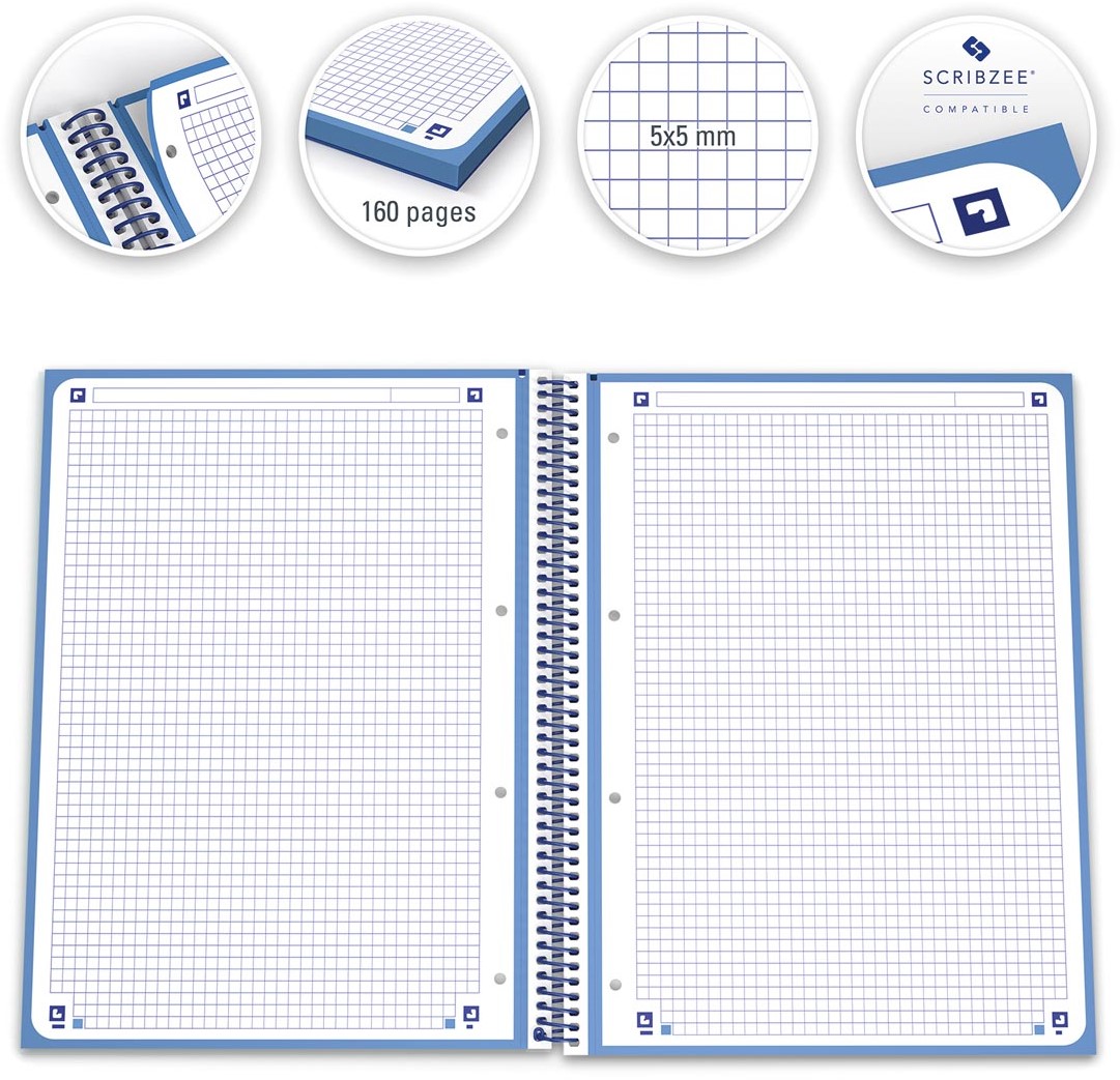 Ft A4+ (29,7 x 22,5 cm) Optik papier van 90 g/m² 160 bladzijden (80 vel) Harde kartonnen kaft Mini whiteboard aan de binnenkant van de kaft Bijpassende gekleurde rand en spiraal Met uitscheurbare vellen en 4-gaatsperforatie Compatibel met Scribzee App PEFC-gecertificeerd