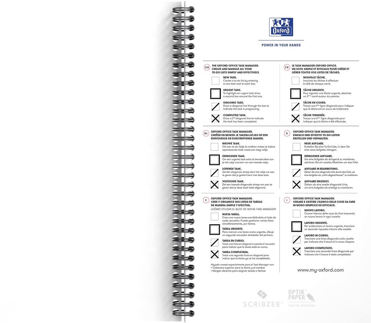Ontdek Office Essentials Task Manager, een speciaal ontworpen notitieboek voor het eenvoudig en effectief maken en beheren van takenlijsten. De Task Manager bevat een eenvoudige methode om taken effectiever te beheren. Begin met het opschrijven van al je taken. Trek een diagonale lijn in het aankruisvak om aan te geven dat een taak is gestart maar nog niet volledig is voltooid. Als de taak urgent is, teken dan een vierkant rond het aankruisvak om visuele identificatie van alle urgente taken te vergemakkelijken. Zodra de taak is voltooid, teken je een tweede diagonale lijn in het aankruisvak of haal je de lijn door. Gebruik dagelijks om je dagelijkse activiteiten bij te houden door snel naar de selectievakjes te kijken. Alle niet-gestarte of dringende taken kunnen gemakkelijk worden geïdentificeerd. Elke pagina is aan beiden kanten bedrukt met een speciaal ontworpen raster om taken te beheren en aantekeningen te maken. Task Manager is spiraal gebonden om het gebruik van beide zijden van het vel te vergemakkelijken. De beschermende voor- en achteromslagen met plastic coating zijn bestand tegen slijtage. ft 14,1 x 24,6 cm 230 bladzijden Certificaat: EU Ecolabel