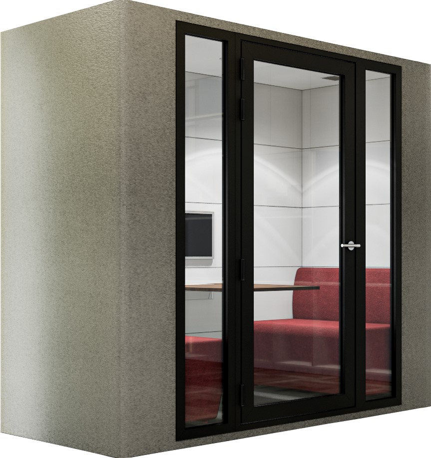De Roof Double Pod is een akoestische stilteruimte, ook wel bekend als akoestische pod. De ruimte is een geweldige oplossing voor kantoorruimtes waar achtergrondgeluid een probleem is. Deze kleine, afgesloten ruimte bied een oase van stilte waar medewerkers zich kunnen concentreren op hun werk zonder afgeleid te worden door het omgevingsgeluid. De Roof Double Pod heeft een akoestische achterwand, de pod is ook leverbaar met glazen achterwand.