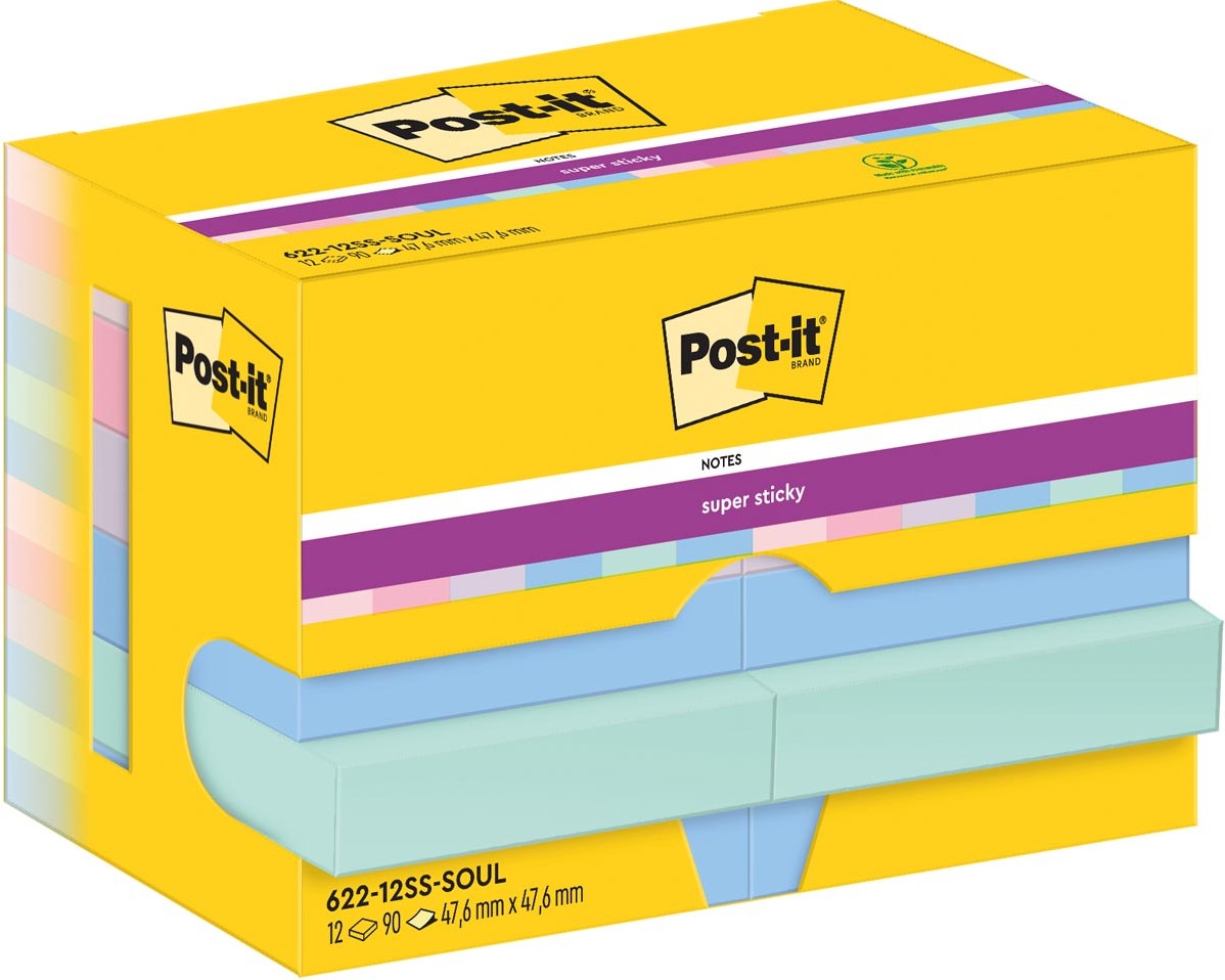 Specificaties Post-It Super Sticky Notes Soulful, 90 vel, ft 47,6 x 47,6 mm, pak van 12 blokken