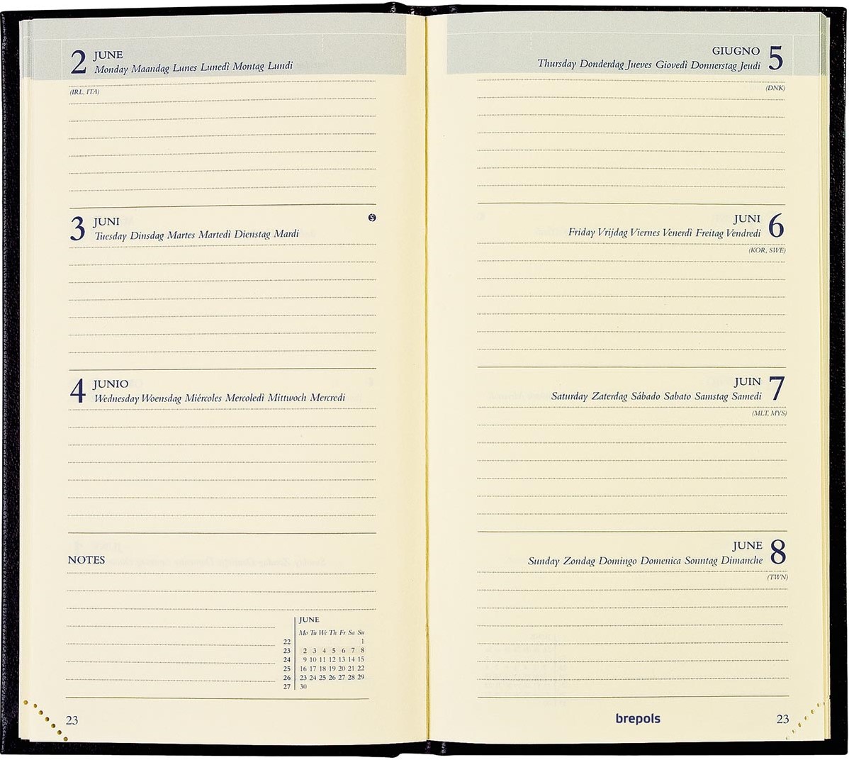 1 week per 2 pagina's 6-talig Boekgebonden Crèmekleurig papier van 60 g/m² Met leeslintje en scheurhoekjes Kaft uit effen kunstleder Ft 90 x 160 mm Certificaat: FSC Mix