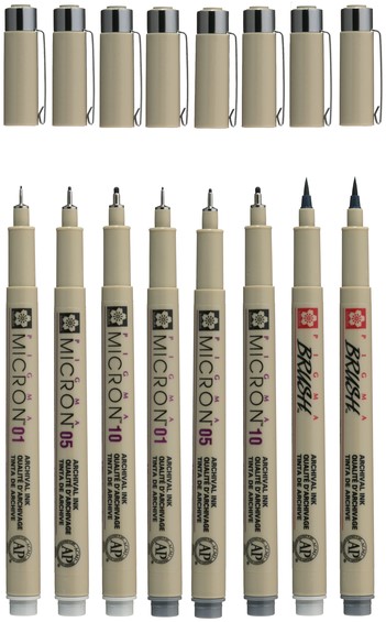 Stel een vraag over Fineliner en brushpen Sakura Pigma Micron koudgrijs set à 8 stuks assorti