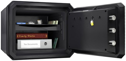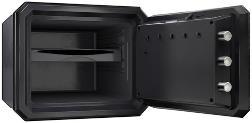 Deze MasterLock kluis heeft een stevige constructie in staal met bescherming tegen vuur en water. Bescherming tegen brand van de multimediadragers. De deur en kast zijn ontworpen om hefboomkrachten te kunnen weerstaan. De deur wordt vergrendeld met 3 stalen pennen Ø 2,5 cm. Het elektronische combinatieslot is programmeerbaar en heeft een toetsenbord met achterverlichting dat werkt op 2 lithiumbatterijen CR123 (inbegrepen).