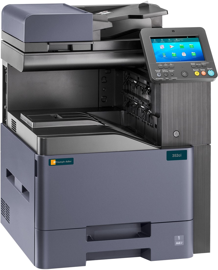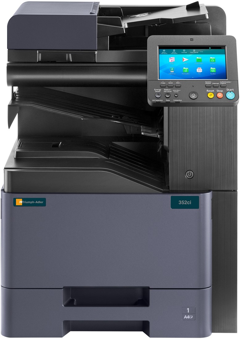 De Triumph-Adler 352ci is een krachtige multifunctionele printer die ontworpen is om te voldoen aan de hoge eisen van moderne kantooromgevingen. Met zijn snelheid van 35 pagina's per minuut voor zowel kleur als zwart-wit printen, is deze machine in staat om snel grote aantallen documenten te verwerken.Maar de 352ci kan meer dan alleen printen. Het is ook een zeer veelzijdige machine voor scannen, kopiëren en faxen. Met de ingebouwde automatische documentinvoer (ADF) kunt u snel en efficiënt meerdere pagina's scannen of kopiëren. En met de faxfunctie kunt u documenten direct verzenden en ontvangen zonder dat u daarvoor een aparte faxmachine nodig hebt.De 352ci beschikt over een groot kleurentouchscreen van 7 inch, waarmee u eenvoudig en intuïtief toegang hebt tot alle functies en instellingen. U kunt zelfs uw persoonlijke voorkeuren opslaan voor snellere toegang tot veelgebruikte functies.Met de optionele finisher kunt u documenten ook eenvoudig en snel afwerken met nieten, perforeren en vouwen. Dit zorgt voor professioneel ogende en georganiseerde documenten.En dankzij de geavanceerde beveiligingsfuncties van de 352ci, zoals de ingebouwde versleuteling van gegevens en toegangscontrole, kunt u erop vertrouwen dat uw vertrouwelijke documenten veilig zijn.Al met al biedt de Triumph-Adler 352ci multifunctionele printer een uitstekende combinatie van snelheid, veelzijdigheid, gebruiksgemak en beveiliging. Het is een krachtige en betrouwbare machine die een waardevolle aanwinst zal zijn voor elke moderne kantooromgeving.Afdrukprijzen op nacalculatie vanaf:Zwart € 0,00835Kleur v.a. € 0,02687Algemeen
