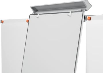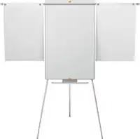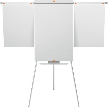 De uitklapbare magnetische armen bevinden zich bovenaan de flipover en kunnen gemakkelijk worden uitgeschoven om extra pagina's te laten zien. De opklapbare pennengoot houdt de markers en magneten op hun plek als u de flipover verplaatst. Verstellen is eenvoudig met de in hoogte verstelbare driepoot en inschuifbare poten.
