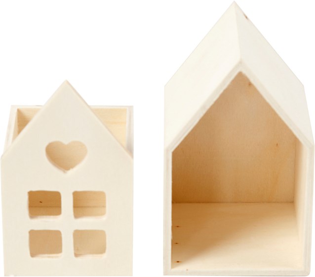 Klein huisje van triplex met met lade en uitgesneden ramen aan de voorkant. Eenvoudig te decoreren met acrylverf, houtbranden, stempels enzovoort.