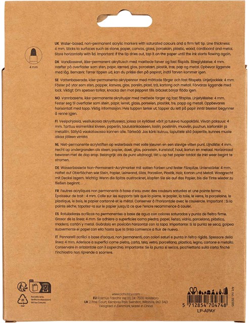 Niet-permanente acrylstiften op waterbasis met volle kleuren en een stevige vilten punt. Te gebruiken op steen, papier, canvas, glas, porselein, plastiek, hout, karton en metaal. De verf is echter vrij waterbestendig als hij droog is. De stift heeft een vaste vilten punt van 4mm dik. Belangrijk: Bewaar liggend met de dop erop, maar als de punt uitdroogt, kunt u hem op het papier stippen tot de inkt weer in de punt stroomt.