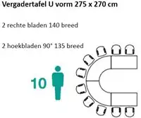 Deze vergadertafel in U vorm is geschikt voor 10 personen om aan te vergaderen. Door de ruime opstelling, kun je elkaar goed zien. Ook is het mogelijk om in het midden te staan wat handig is voor presentaties of verstaanbaarheid.