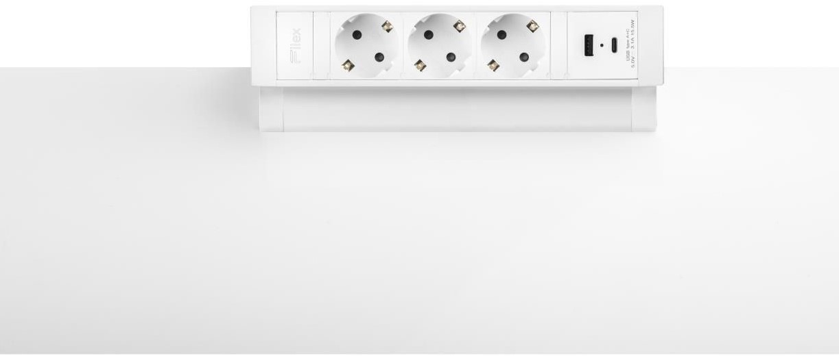 • De opbouwunit van Felix Desk up - 2.0 is een mooie oplossing voor werkplekken. Deze fraaie witte ranke opbouwunit is standaard uitgerust met 2 klemmen voor bladdiktes van 15-45mm. De unit is eenvoudig van bovenaf te klemmen en is voorzien van een vast aansluitsnoer aan achterzijde met een lengte van 40cm met 3-polige connector  stekker. De opbouwunit is uitgerust met 3 x 230V aansluiting en een dubbele USB charger 5V-3.1A.