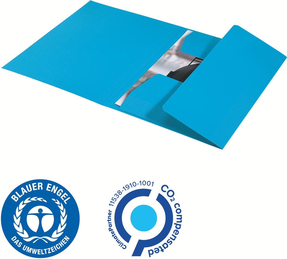 Voor ft A4 (24,2 x 31,8 cm) Uit karton van 430 g/m² Met 3 kleppen Capaciteit: 250 vel Certificaat: Blauwe Engel Gerecycleerd materiaal: 100 %