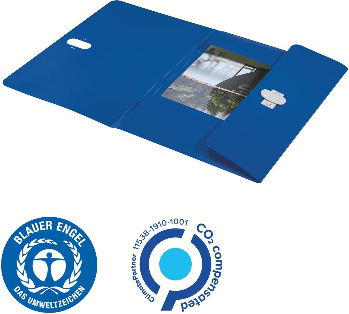 Voor ft A4 (23,5 x 32 cm) Uit PP Met 3 kleppen Met draaiknop Capaciteit: 150 vel Certificaat: Blauwe Engel Gerecycleerd materiaal: 80 %
