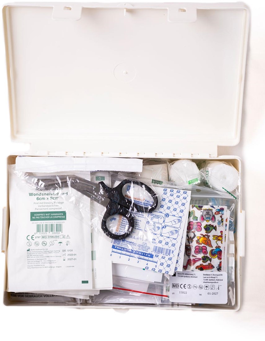 Inhoud: - 10 x kinderpleister ft 10 x 6 cm - 1 x wondsnelverband ft 6 x 8 cm - 1 x snelverband gerold ft 6 x 8 cm - 6 x niet verklevend kompres ft 7,5 x 7,5 cm - 2 x gaaskompres 1/16 - 2 x gaaskompres ft 5 x 5 cm - 1 x tekentang - 1 x splinterpincet - 1 x verbandschaar 14 cm - 1 x elastisch hydrofiel windsel 4 cm - 1 x elastisch hydrofiel windsel 6 cm - 1 x instant cold pack - 1 x assortiment kinderpleisters, 20 stuks - 1 x desinfectant 30 ml - 1 x universeel windsel 6 cm - 1 x wondpleisterft 100 x 6 cm - 1 x set wegwerphandschoenen, 2 stuks - 1 x zelfhechtend windsel 6 cm - 1 x hechtpleister ft 500 x 2,5 cm - 1 x mondkapje voor beademing - 1 x reddingsdeken - 1 x set hechtstrips, 10 stuks - 1 x stroomdiagram - 3 x brandwondensachet3,5 ml