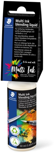 Staedtler Multi Ink blending liquid. Deze blender lost de permanente Multi Ink op: Hiermee kunnen kleuren worden gemengd, gladde kleurovergangen en gradients worden gecreëerd, evenals aquarel- en ombré-effecten. Kleuren kunnen worden opgefrist: kan worden gebruikt om lichtreflecties te creëren en zelfs om kleine foutjes te corrigeren. Blender op waterbasis met een lage geur. Optimale resultaten kunnen worden bereikt op aquarelpapier en op niet-absorberende oppervlakken. Breng eenvoudigweg de mengvloeistof aan met een kwast of vul de tank van een waterkwast.