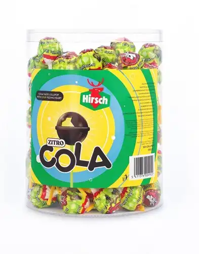 Specificaties Hirsch Zitro Cola Lolly, 100 stuks, pot van 1,2 kg