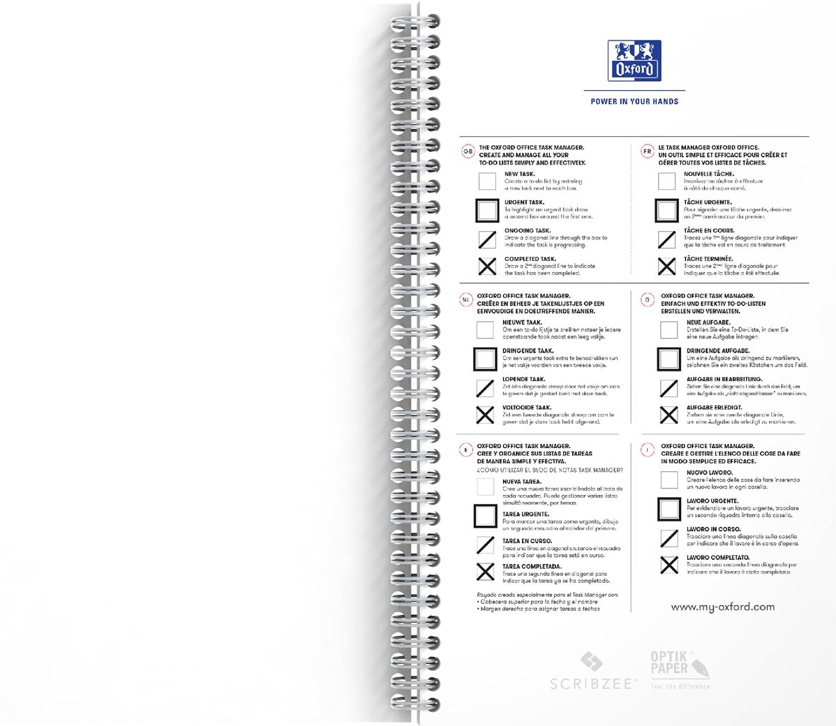 Ontdek Office Essentials Task Manager, een speciaal ontworpen notitieboek voor het eenvoudig en effectief maken en beheren van takenlijsten. De Task Manager bevat een eenvoudige methode om taken effectiever te beheren. Begin met het opschrijven van al je taken. Trek een diagonale lijn in het aankruisvak om aan te geven dat een taak is gestart maar nog niet volledig is voltooid. Als de taak urgent is, teken dan een vierkant rond het aankruisvak om visuele identificatie van alle urgente taken te vergemakkelijken. Zodra de taak is voltooid, teken je een tweede diagonale lijn in het aankruisvak of haal je de lijn door. Gebruik dagelijks om je dagelijkse activiteiten bij te houden door snel naar de selectievakjes te kijken. Alle niet-gestarte of dringende taken kunnen gemakkelijk worden geïdentificeerd. Elke pagina is aan beiden kanten bedrukt met een speciaal ontworpen raster om taken te beheren en aantekeningen te maken. Task Manager is spiraal gebonden om het gebruik van beide zijden van het vel te vergemakkelijken. De beschermende voor- en achteromslagen met plastic coating zijn bestand tegen slijtage. ft 14,1 x 24,6 cm 230 bladzijden Certificaat: EU Ecolabel