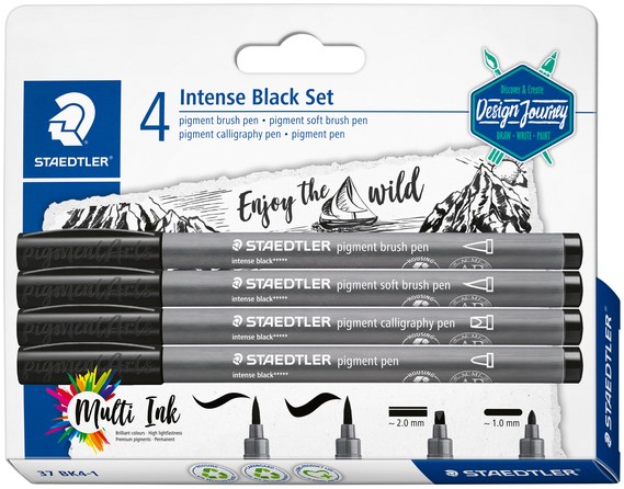 Deze Staedtler Intense black set bestaat uit: 1 pigment brush, 1 pigment soft brush, 1 pigment calligraphy en 1 pigment pen.
