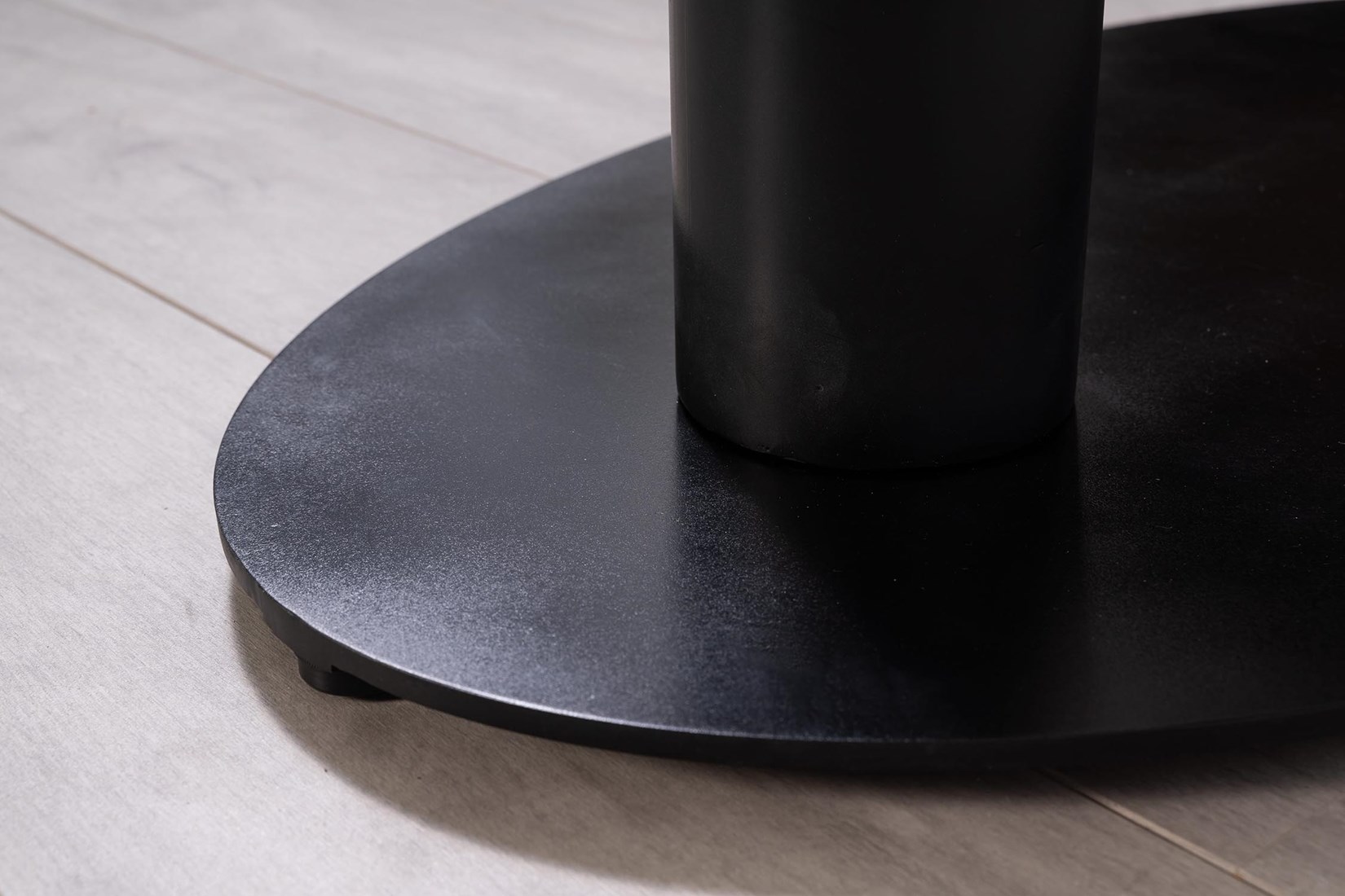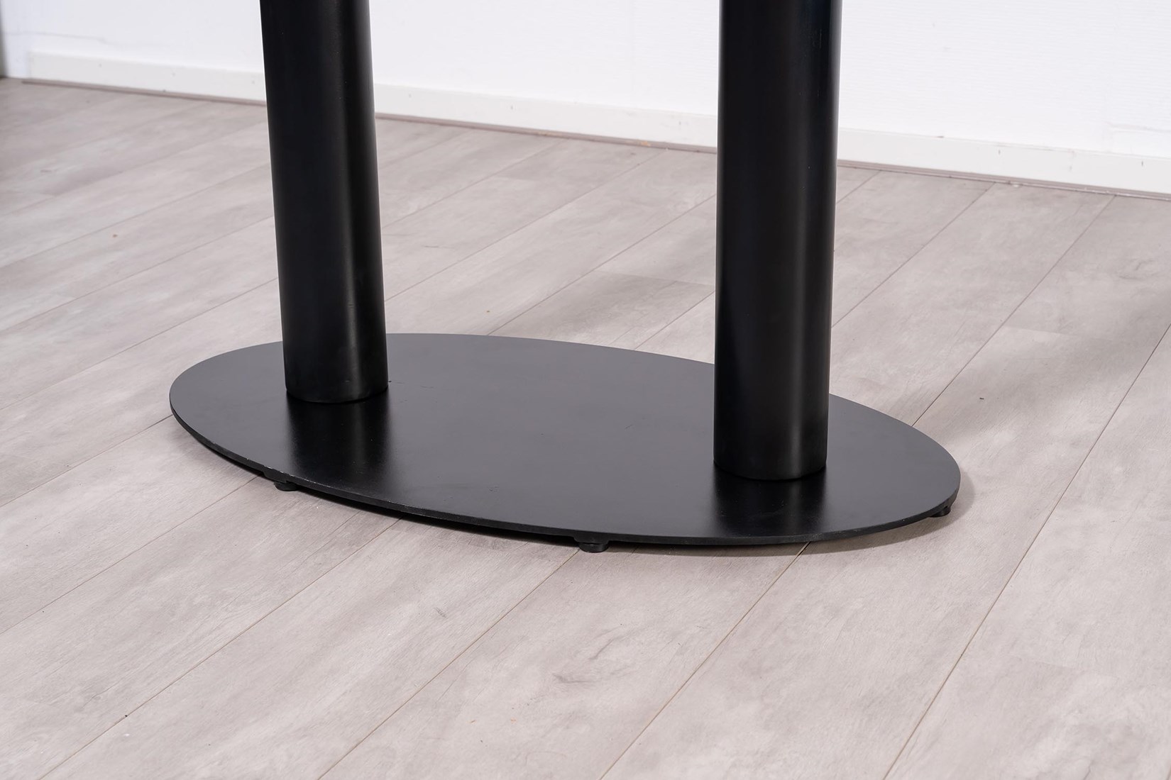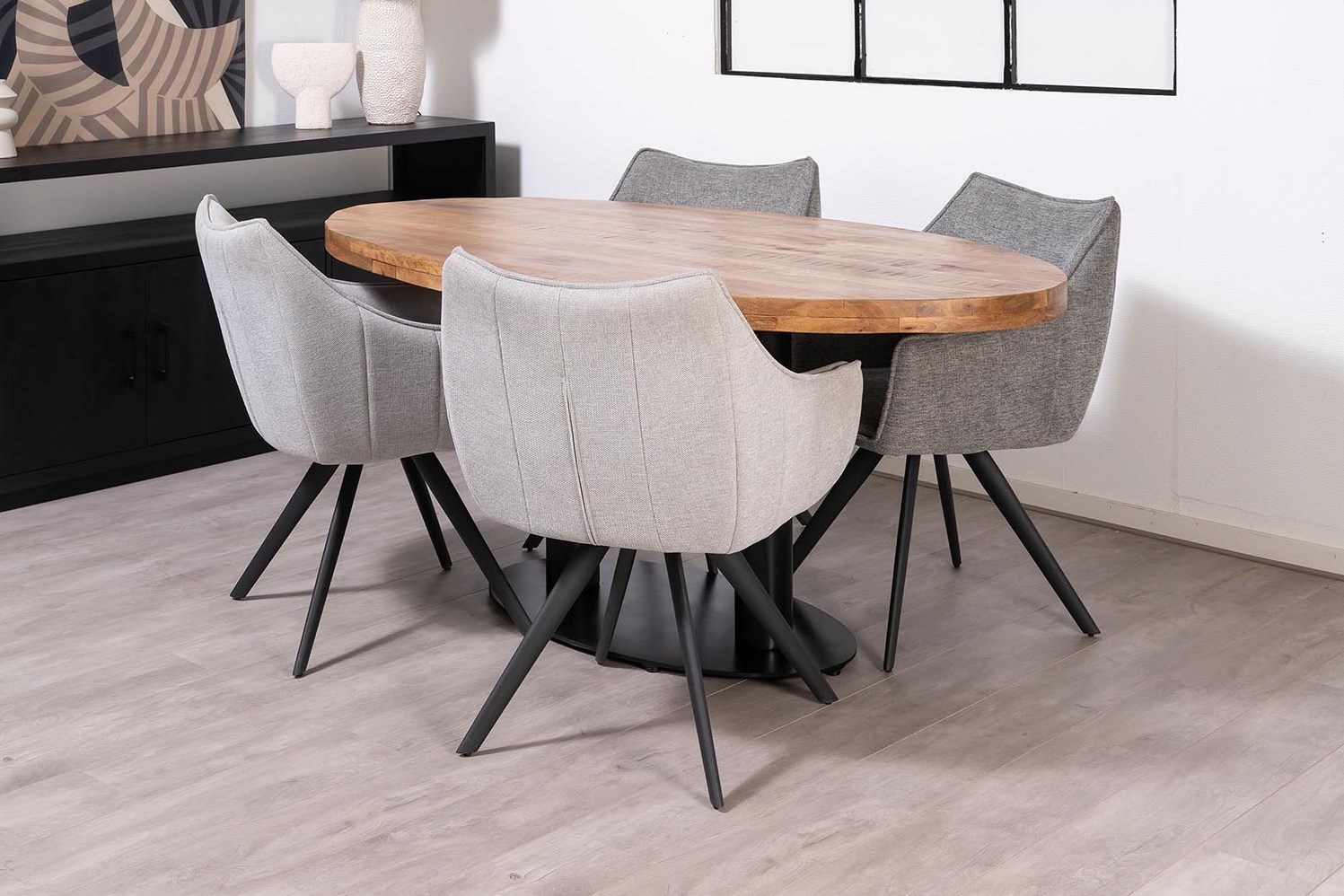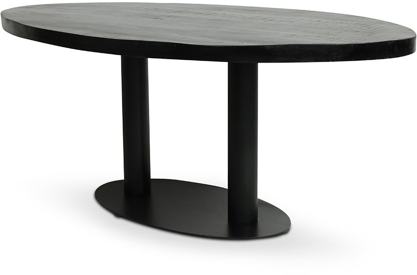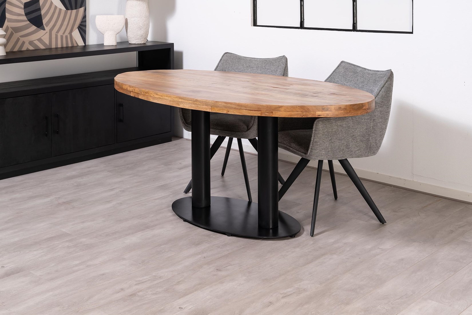 Prachtige ovale tafel van mangohout die te gebruiken is als vergadertafel of kantinetafel. Deze mango houten tafel heeft de mooie combinatie van mangohout en zwart staal. Een stijlvolle toevoeging in iedere bedrijfsruimte. De tafel heeft een strak frame van zwart gepoedercoat staal. Het frame bestaat uit een zwarte grondplaat waarop twee staanders staan die het tafelblad ondersteunen. Het tafelblad is van mangohout dat in twee lagen van 3 cm is opgebouwd. De totale dikte is dus 6cm waarmee je een robuuste tafel met karakter hebt. Deze mango houten tafel is beschikbaar in verschillende afmetingen in zwart of naturel mangohout.