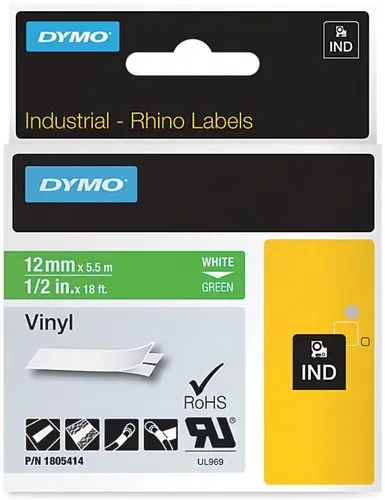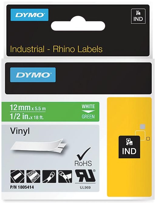 Artikelomschrijving Dymo RHINO vinyltape 12 mm, wit op groen
