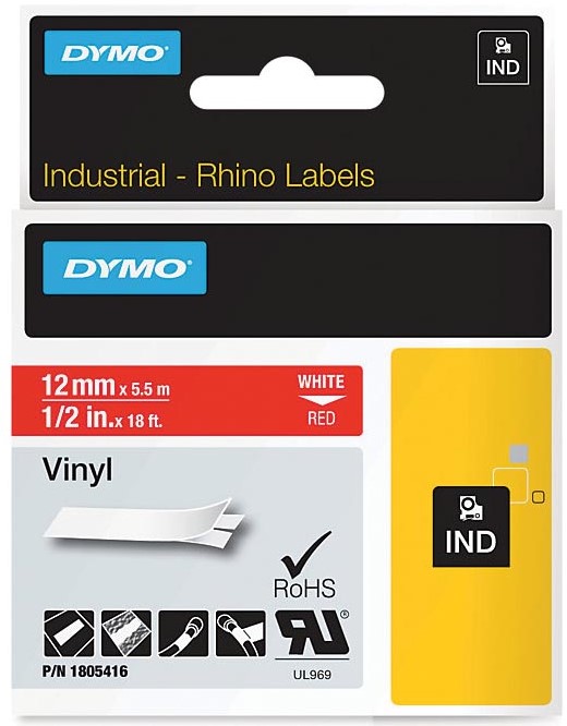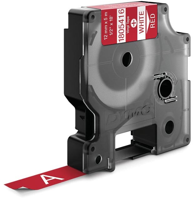 Artikelomschrijving Dymo RHINO vinyltape 12 mm, wit op rood