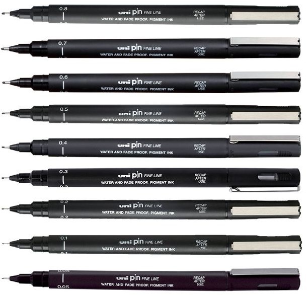 Set van Uni-ball Pin 5 brush art pennen. De inkt van deze pennen is weerbestendig, waterbestending en oplosmiddelbestendig en vervaagt niet. Hierdoor blijven tekeningen lang bewaard. De pen beschikt over een regelmatige inkttoevoer en is ondermeer geschikt voor plattegronden, lichtdrukken en schetsen.