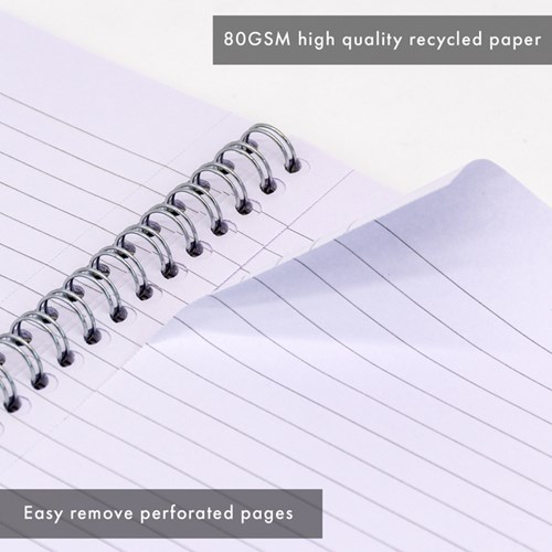 Het gerecyclede notitieblok heeft een A5-formaat van 145 mm x 210 mm en is gemaakt van 100% gerecycled 80gr papier van hoge kwaliteit. Elk notitieblok bevat 110 pagina's met een 8 mm-regel en een geperforeerde rand voor eenvoudig verwijderen. Het compacte A5-formaat is ideaal om onderweg notities te maken of herinneringen op te schrijven, omdat ze gemakkelijk in veel tassen passen. De gerecyclede notitieblokken worden verkocht in een verpakking van 3. Het beste deel is dat onze notitieblokken 100% gerecycled zijn, dus we helpen de planeet te redden!