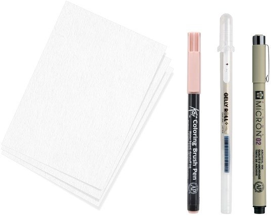 Verkrijgbaar in 4 sets met Japanse thema's. Elke set bevat 3 Sakura favorieten: een Pigma Micron fineliner, een Gelly Roll pen en een Koi Coloring Brush Pen, papier en de link naar een gratis video tutorial. Alles wat je nodig hebt om meteen aan de slag te gaan!