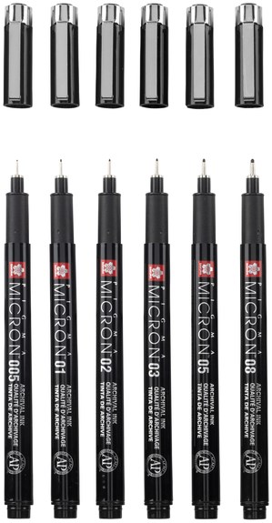 Deze set bevat 6 Pigma Micron fineliners in de populairste maten: 1 x 005 (0.2 mm), 1 x 01 (0.25 mm), 1 x 02 (0.30 mm), 1 x 03 (0.35 mm), 1 x 05 (0.45 mm), 1 x 08 (0.50 mm) en een gratis vilten etui.
