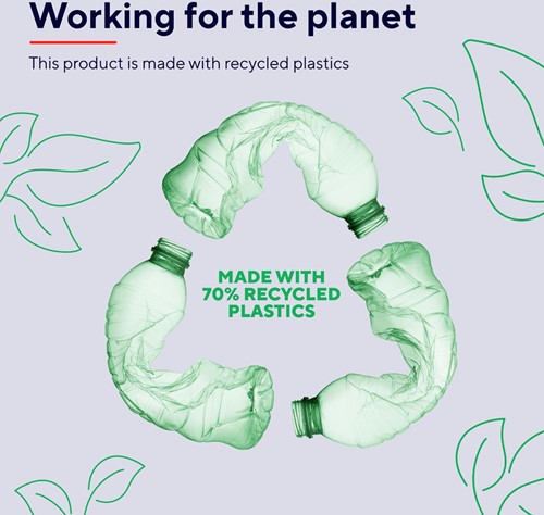 uit 70 % gerecycleerd kunststof, draadloos, met opbergbare micro-USB-ontvanger, draadloos bereik van 10 m, werkt op ingebouwde batterij, oplaadbaar via USB-C poort