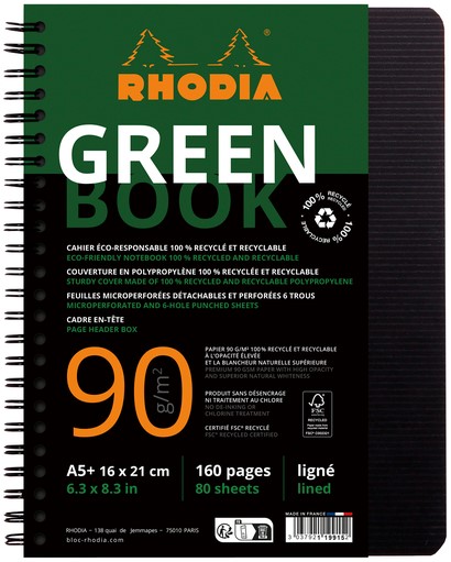 Rhodiactive Greenbook gelijnd, A5+, 6-gaats perforatie, 90g FSC® gerecycled papier Het Greenbook voldoet aan alle eisen: mooi, functioneel EN 100% gerecycled en recyclebaar. Op kantoor of onderweg, kies voor een eco-verantwoord professioneel notitieboek. Onder de elegante soberheid van de zwarte kaft van gerecycled polypropyleen,met groene opdruk, maak je aantekeningen op het opmerkelijke Clairefontaine 90 g/m2 gerecycled papier, met zijn hoge opaciteit en superieure natuurlijke witheid. 100% gerecycled en recyclebaar polypropyleen omslag, 160 microgeperforeerde en geperforeerde pagina's (A4+: 4-gaats perforatie / A5+: universele 6-gaats perforatie). Geproduceerd zonder ontinkting of chloorbehandeling. FSC® gerecycled certificering.