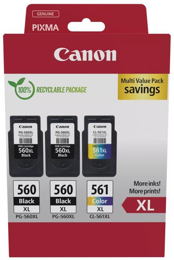 Artikelomschrijving Canon inktcartridge 2 x PG-560XL + 1 x CL-561XL, 300 - 400 pagina's, OEM 3712C009, 4 kleuren